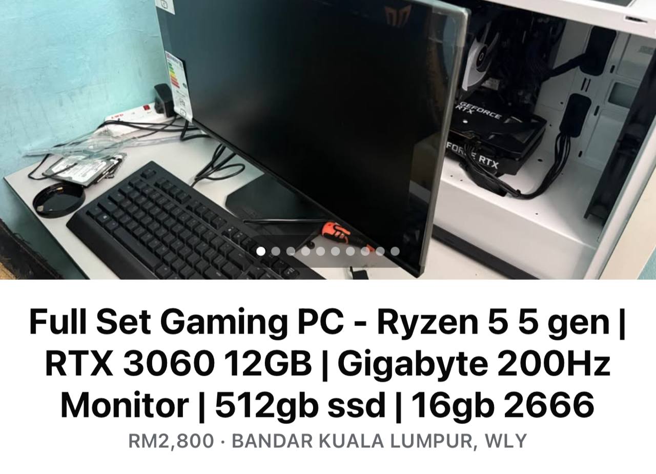 Cuma tidak ber RGB Jee More new part 🎮 PC GAMING ESPORTS READY! Spec padu untuk Valorant (300+ FPS), GTA V, Cyberpunk, Editing & Streaming. Beli terus Plug & Play! ✅ HIGHLIGHT PALING MAHAL: 1. Monitor 200Hz: Gigabyte 200Hz Gaming Monitor. Smooth gila untuk main FPS, bukan 144Hz biasa! (Barang New/Open Box). 2. GPU Warranty Panjang: MSI RTX 3060 12GB. Warranty sampai 2028. Main tanpa was-was! 3. Mouse Premium: Razer Deathadder V2 Hyperspeed (Warranty 3 Tahun). ⚙️ SPESIFIKASI PENUH: • GPU: MSI Ventus 2X RTX 3060 12GB OC (Warranty 2028) • CPU: AMD Ryzen 5 5500 - 6 Core 12 Thread • MOBO: MSI AM4 Mainboard • RAM: 16GB HyperX Fury Gaming RAM • SSD: 512GB M.2 SSD (Laju, Windows boot 10 saat) • PSU: DeepCool PF700 (700W) 80+ Bronze (New) • COOLER: Ocypus Gamma (Aftermarket Cooler) • CASE: Tecware Gaming Case • MONITOR: 24.5" Gigabyte GS25F2 200Hz IPS (New) Set sekali: • Razer Cynosa V2 Gaming Keyboard (RGB) • Condition: used, tapi function tiptop.